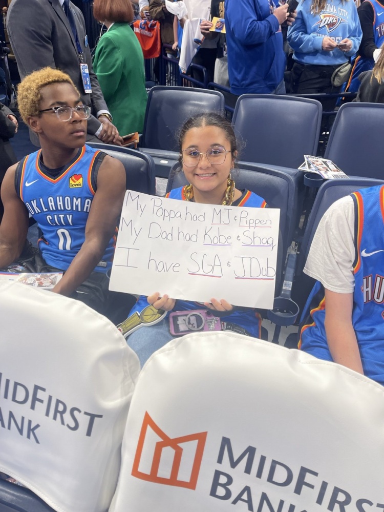 这位雷霆球迷手举手写牌,上面写道:“我的爷爷有乔丹和皮蓬,我的爸爸有科比和奥尼尔,而我有亚历山大和杰伦-威廉姆斯。”